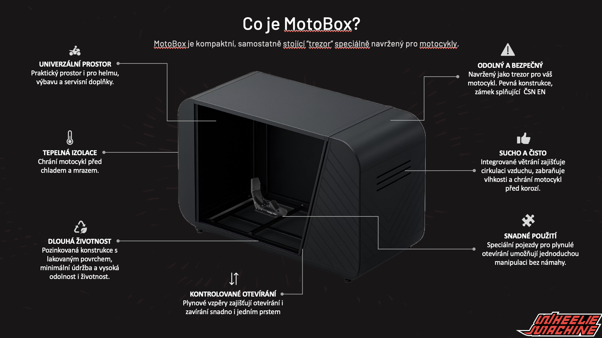 MotoBox je kompaktní, samostatně stojící garáž speciálně navrženyá pro motocykly. Jedná se o revoluční řešení pro uskladnění Vašeho motocyklu. Výhody MotoBoxu: Žádné stavební povolení - MotoBox lze umístit prakticky kamkoliv bez nutnosti zdlouhavého vyřizování stavebních povolení. Ochrana před živly - Odolná konstrukce chrání váš motocykl před deštěm, sněhem, prachem i UV zářením. Bezpečnost - Robustní konstrukce z pevných materiálů chrání váš stroj před krádeží i vandalismem. Prostor pro vybavení - Uvnitř motoboxu si můžete uskladnit základní vybavení např. kombinézu, helmu, přípravky na údržbu a servis. Doporučujeme variantu včetně zateplení. Tento prvek chrání motocykl před rychlými výkyvy teplot a tím snižuje riziko kondenzace vlhkosti.